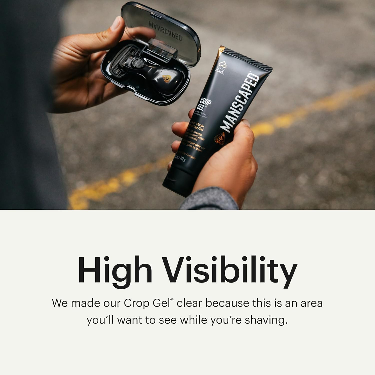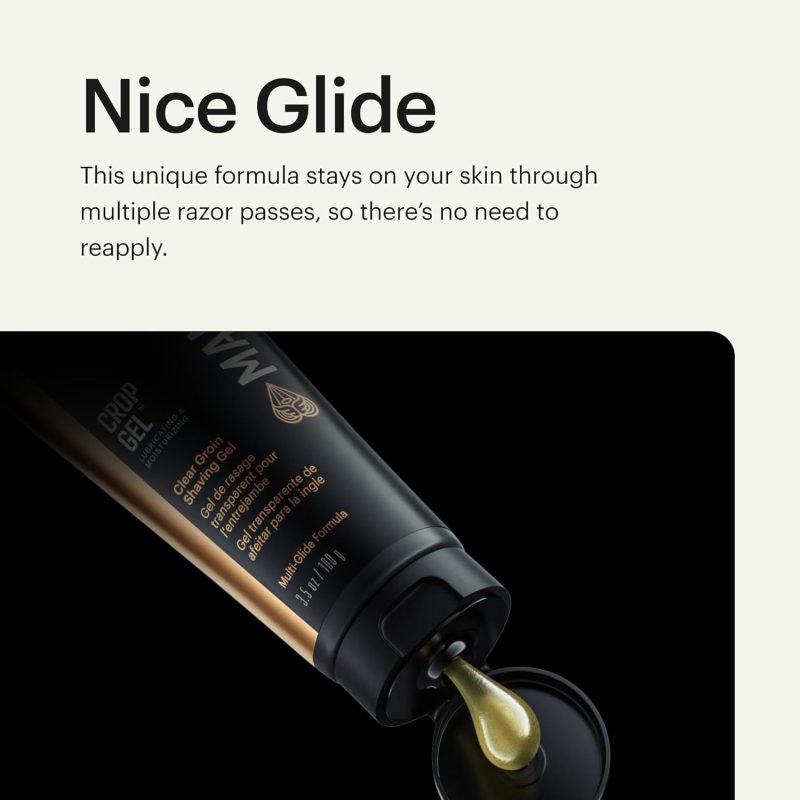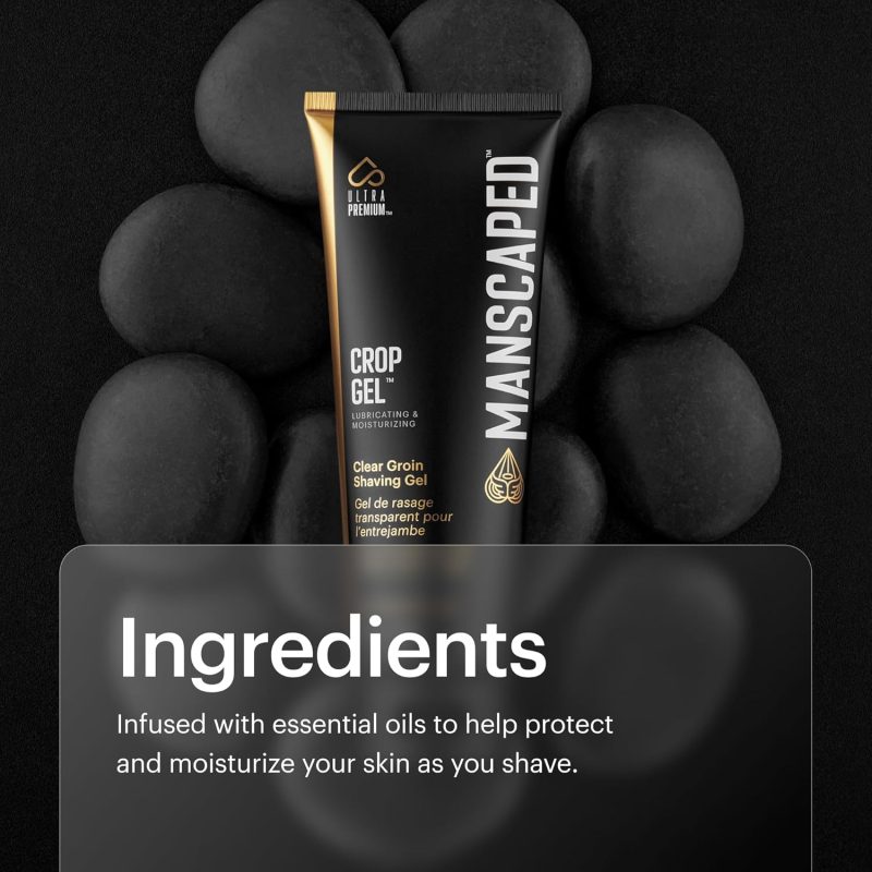 - CROP GEL: is a unique clear ball shaving gel specially formulated for the groin area so you can see what you’re shaving. Mildly important.